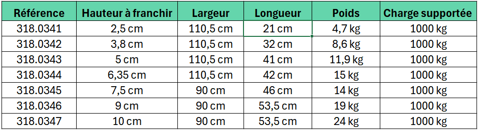 - Hauteurs disponibles : Pour s'adapter à diverses configurations, plusieurs hauteurs sont proposées : 2,5 cm, 3,8 cm, 5 cm, 6,35 cm, 7,5 cm, 9 cm et 10 cm, permettant de choisir la rampe correspondant précisément à la hauteur du seuil à franchir.